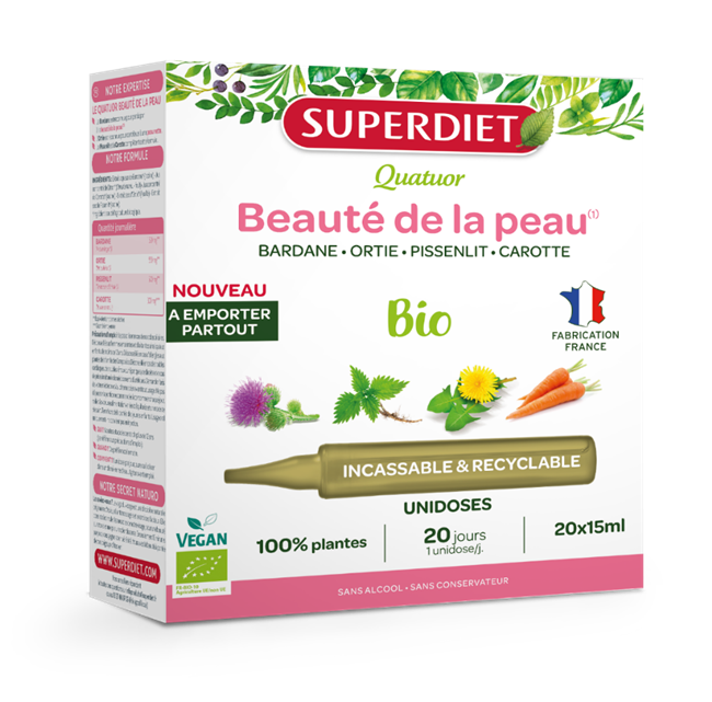 | Ingredientes | Extracto acuoso de Bardana* (raíces - Arctium lappa L.) (355 mg**), Diente de León* (raíces - Taraxacum officinale Weber) (355 mg**), Pensamiento Salvaje* (partes aéreas florecidas - Viola tricolor) (266 mg**), Zumo concentrado de Zanahoria* (raíces - Daucus carota) (300 mg***). 15 ml Bardana* (Arctium lappa L.) 355 mg** Diente de León* (Taraxacum officinale Weber) 355 mg** Pensamiento Salvaje* (Viola tricolor) 266 mg** Zanahoria* (Daucus carota) 300 mg** *Ingrediente procedente de la agricultura ecológica |