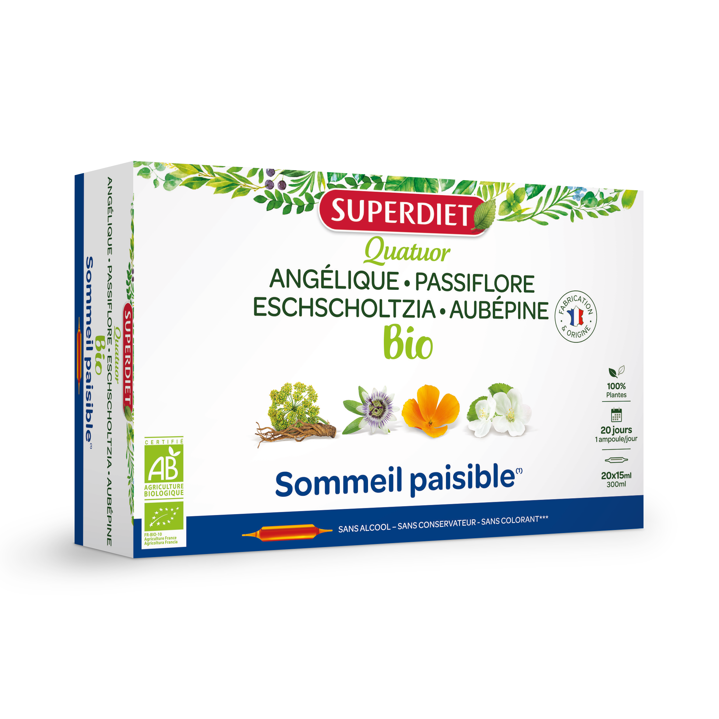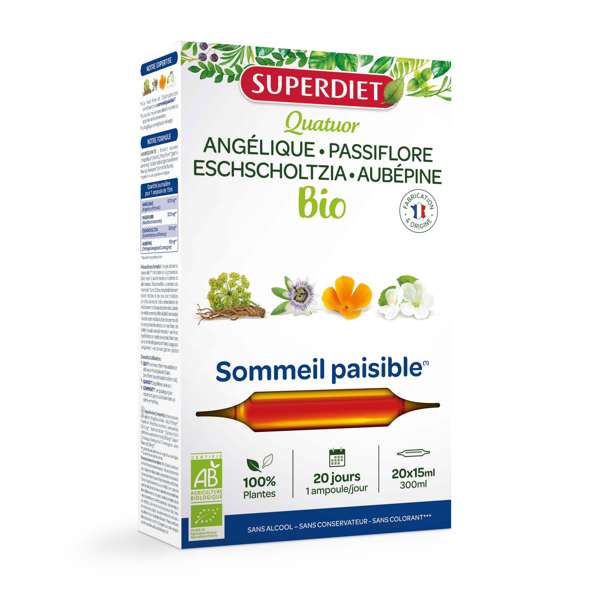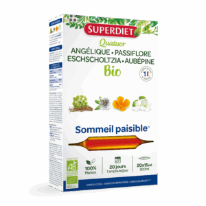 Extracto acuoso de Angélica* (Angelica archangelica) (raíces) (487,5 mg**), Pasiflora* (Passiflora incarnata L) (partes aéreas) (337,5 mg**), Amapola de California*(Eschscholtzia californica) (partes aéreas florecidas) (300 mg**), Espino Blanco* (Crataegus monogyna) (sumidades florecidas) (150 mg**).