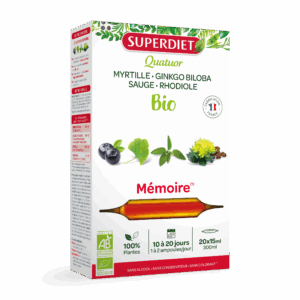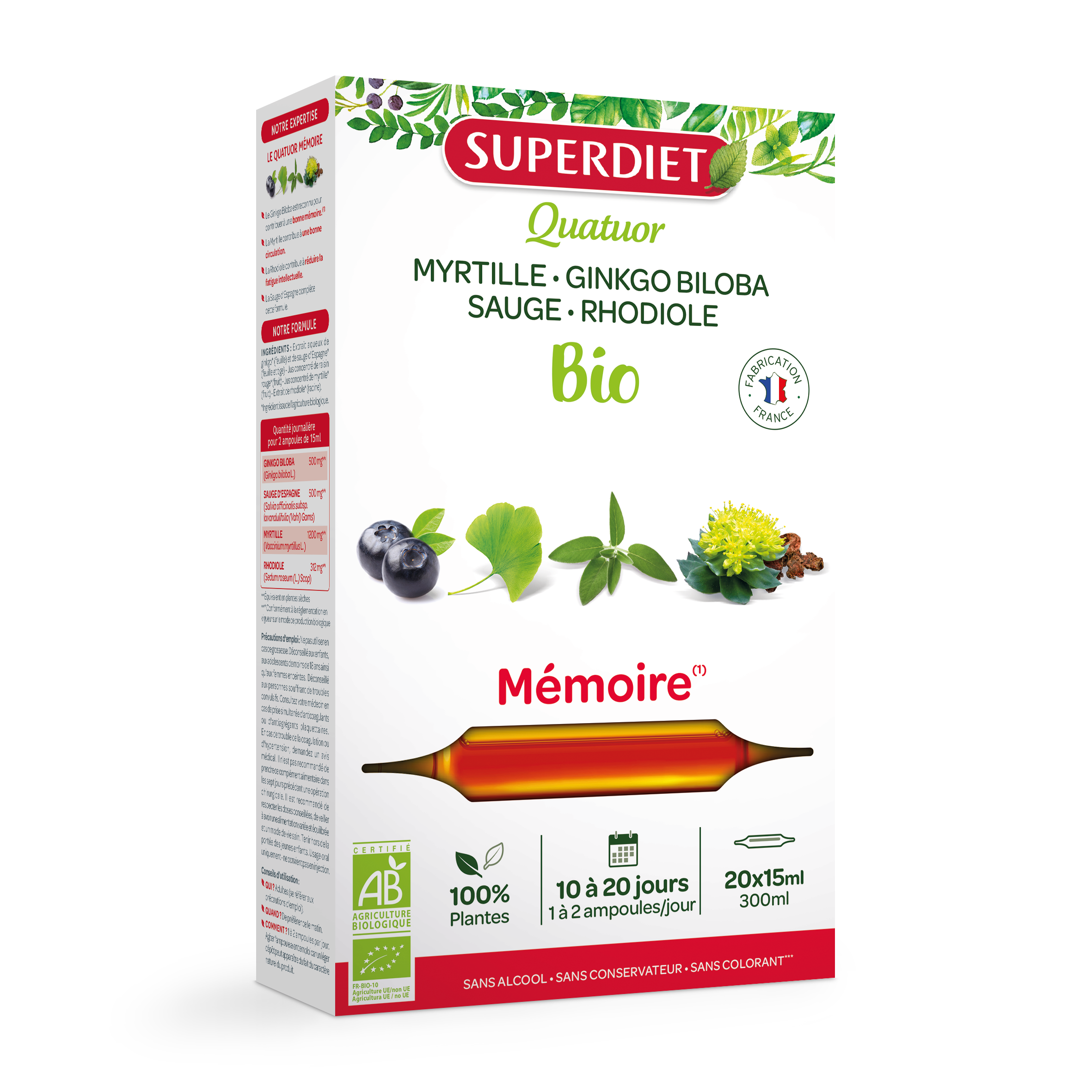 | Ingredientes | Extracto acuoso de Ginkgo* (Ginkgo Biloba – hojas) (500 mg**), Arándano Negro*(Vaccinium Myrtillus L.-fruto) (1200 mg**), y Salvia de España (Salvia Lavandulifolia – hojas) (500 mg**), Zumo concentrado de Uvas rojas (Vitis Vinifera - fruta) (4,5 ml***). Extractos secos de Rhodiola (Rodhiola rosea – raíz) (1 000 mg**). **Equivalente en plantas secas por 2 ampollas de 15 ml |