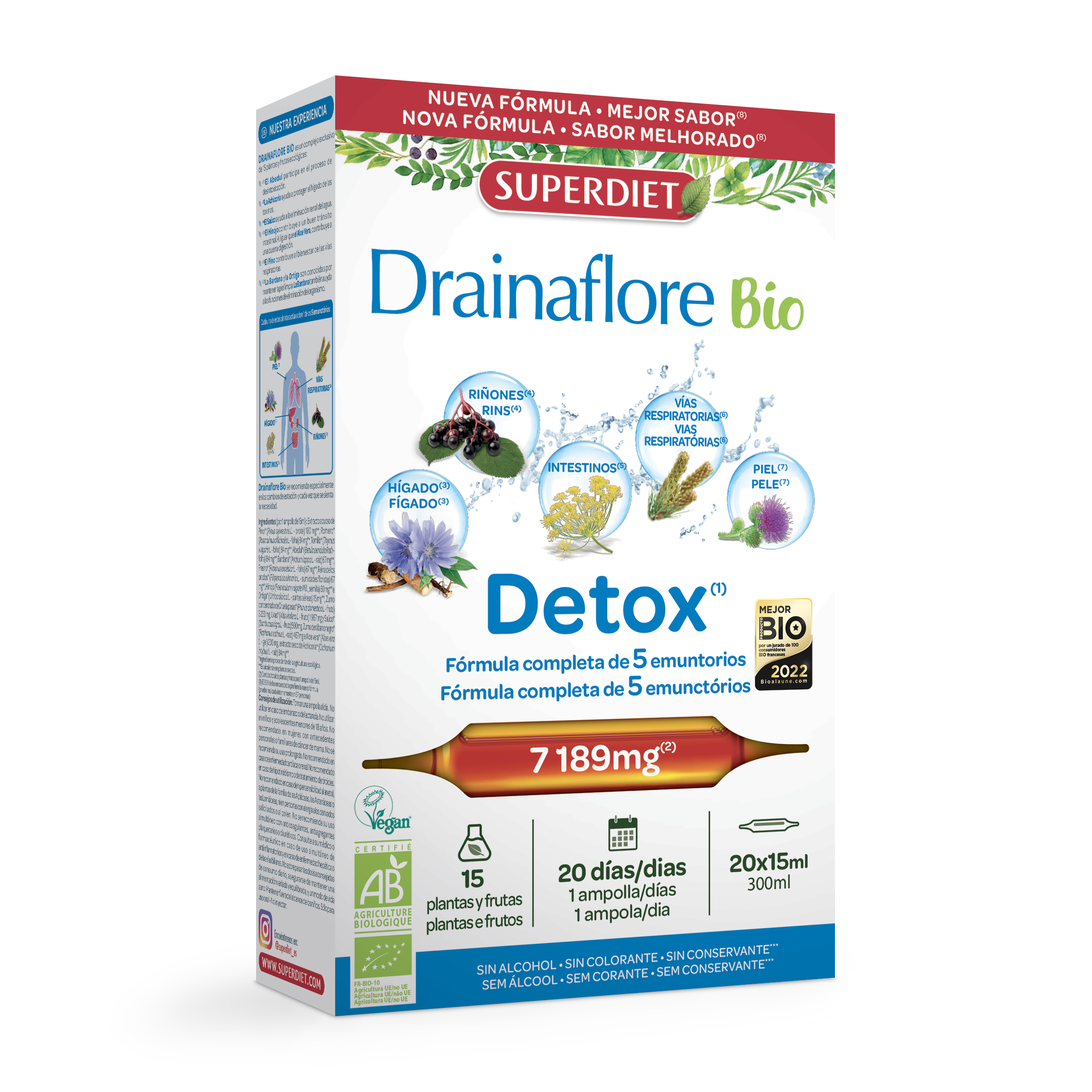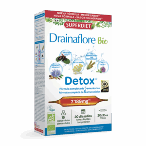 Ingredientes: Extracto acuoso de Malva* (hoja – Malva sylvestris) (84 mg**), Grama (rizoma – Elumus repens) (84 mg**), Romero* (Hoja – Rosmarinus officinalis) (84 mg**), Achicoria* (Raiz – Cichorium intybus) (84 mg**), Pensamiento salvaje* (Parte aérea florida – Viola tricolor) (84 mg**), Tomillo* (Hoja – Thymus vulgaris) (84 mg**), Abedul* (Hoja – Betula alba) (84 mg**), Bardana* (Raiz – Arctium lappa) (67 mg**), Fresno* (Hoja – Fraxinus excelsior) (67 mg**), Reina de los prados* (Sumidad florida – Filipendula ulmaria) (67 mg**) – Zumo concentrado de Ciruela* (Fruta – Prunus domestica) (3233 mg***), Uvas negras* (Fruta – Vitis vinifera) (1967 mg***), y Saúco* (Fruta – Sambucus nigra) (500 mg***) – Puro Zumo de Rábano negro* (Raiz – Raphanus sativus) (467 mg***) y Aloe vera* (Aloe Barbadensis miller) (227 mg***).