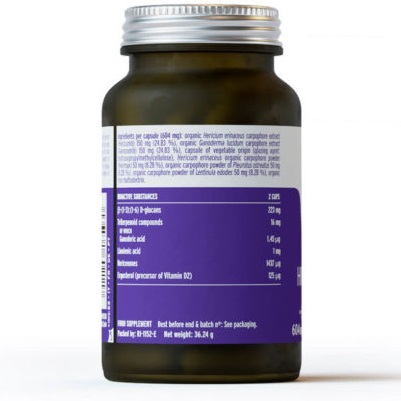 | Ingredientes | Extracto ecológico de Melena de León (Hericium erinaceus HdT1428 DSM 34087, Herizumib®) 150 mg, extracto ecológico de Reishi (Ganoderma lucidum HdT488 DSM 32782, Ganozumib®) 150 mg, polvo ecológico micronizado de Melena de León (Hericium erinaceus HdT1428 DSM 34087, Herimax®) 50 mg, polvo micronizado de Pleurotus (Pleurotus ostreatus), polvo ecológico micronizado de Shiitake (Lentinula edodes). |