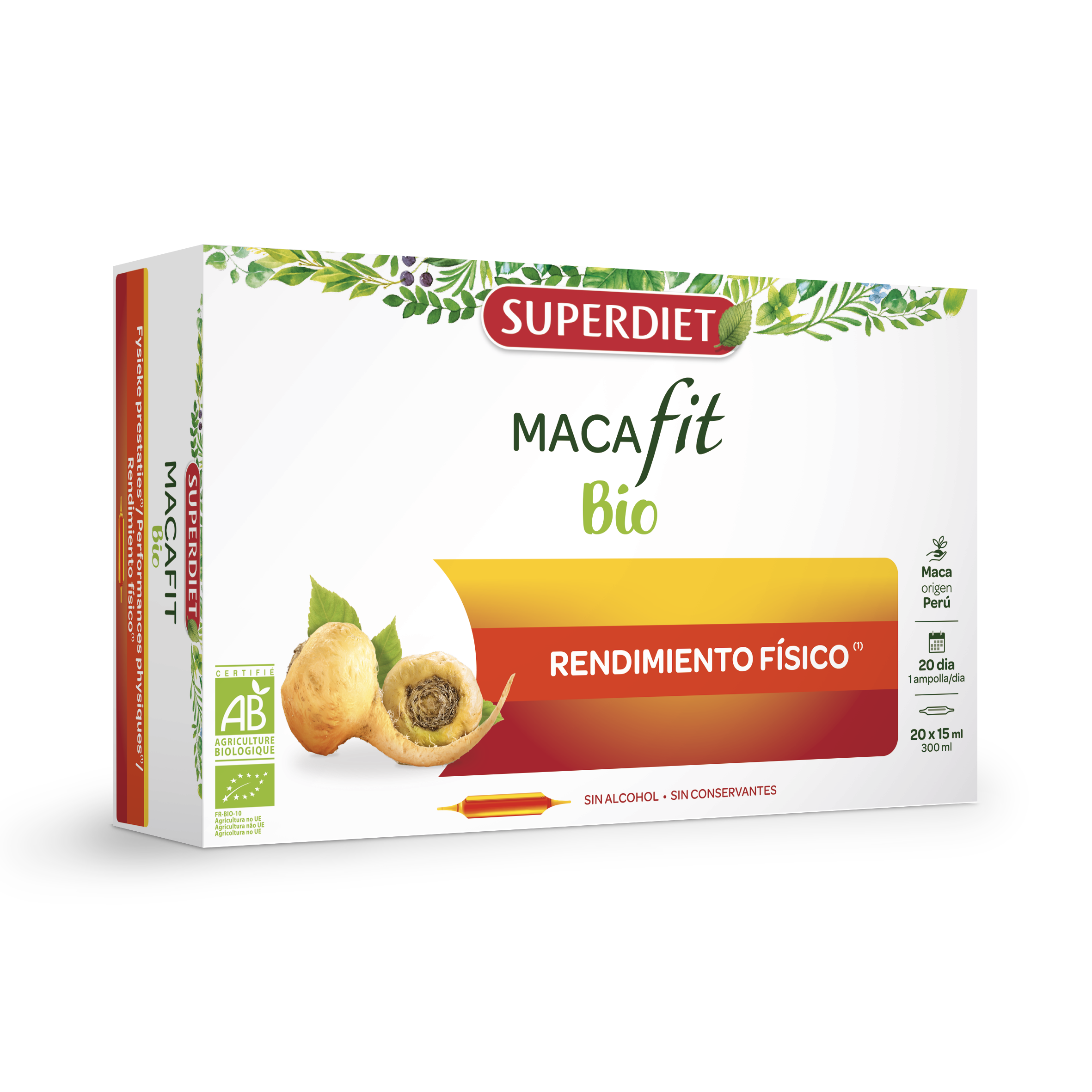 | Ingredientes | Agua purificada, Maca* (raíz) (525 mg**) *Ingrediente proveniente de la agricultura ecológica Origen : Perú |