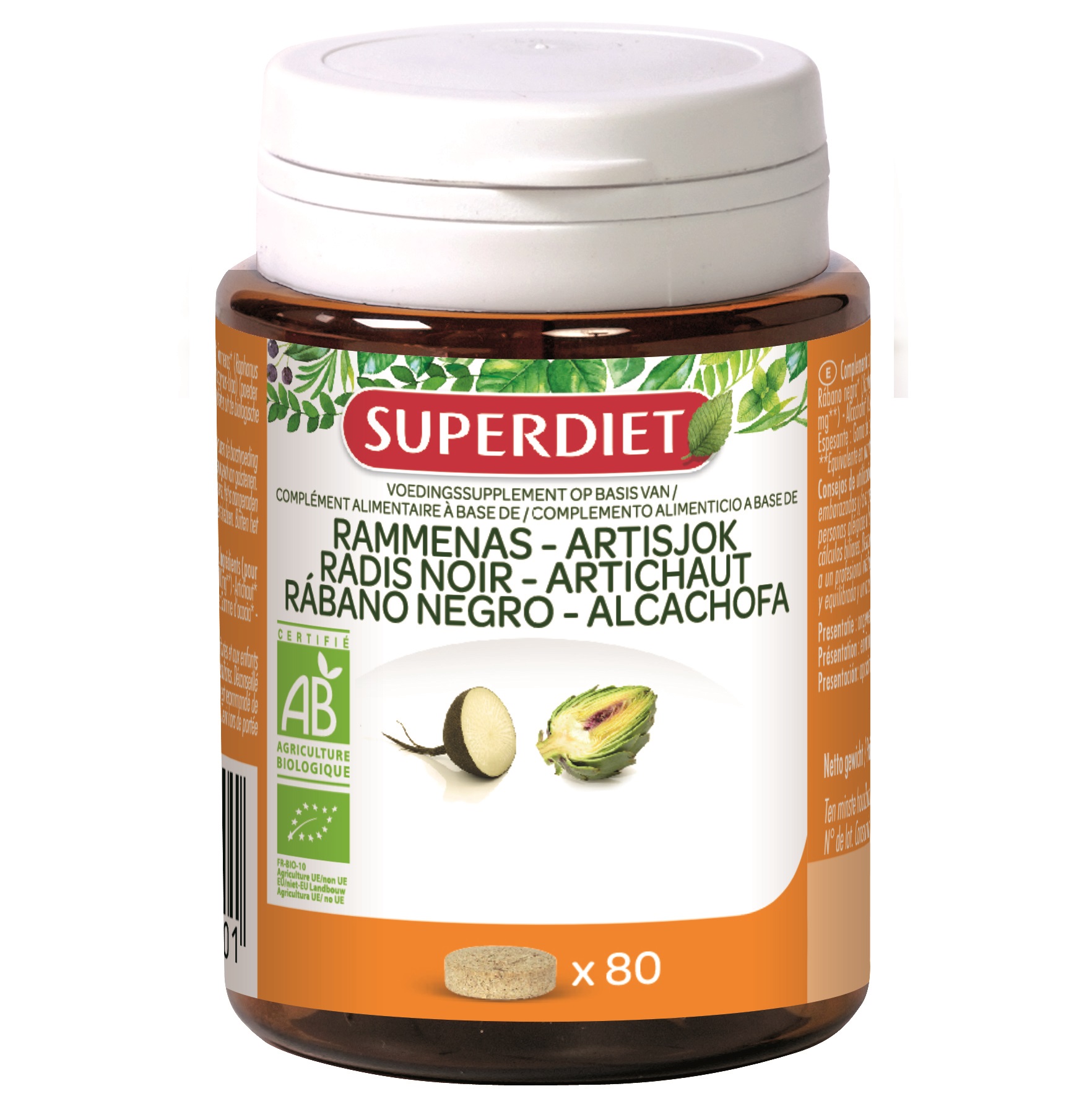 | Ingredientes | Rábano negro* (400mg**) (polvo y extracto (soporte: maltodextrina)) – Alcachofa* (400mg**) (polvo y extracto (soporte: maltodextrina)) – Agente de carga: Goma de * Procedente de la agricultura ecológica. |